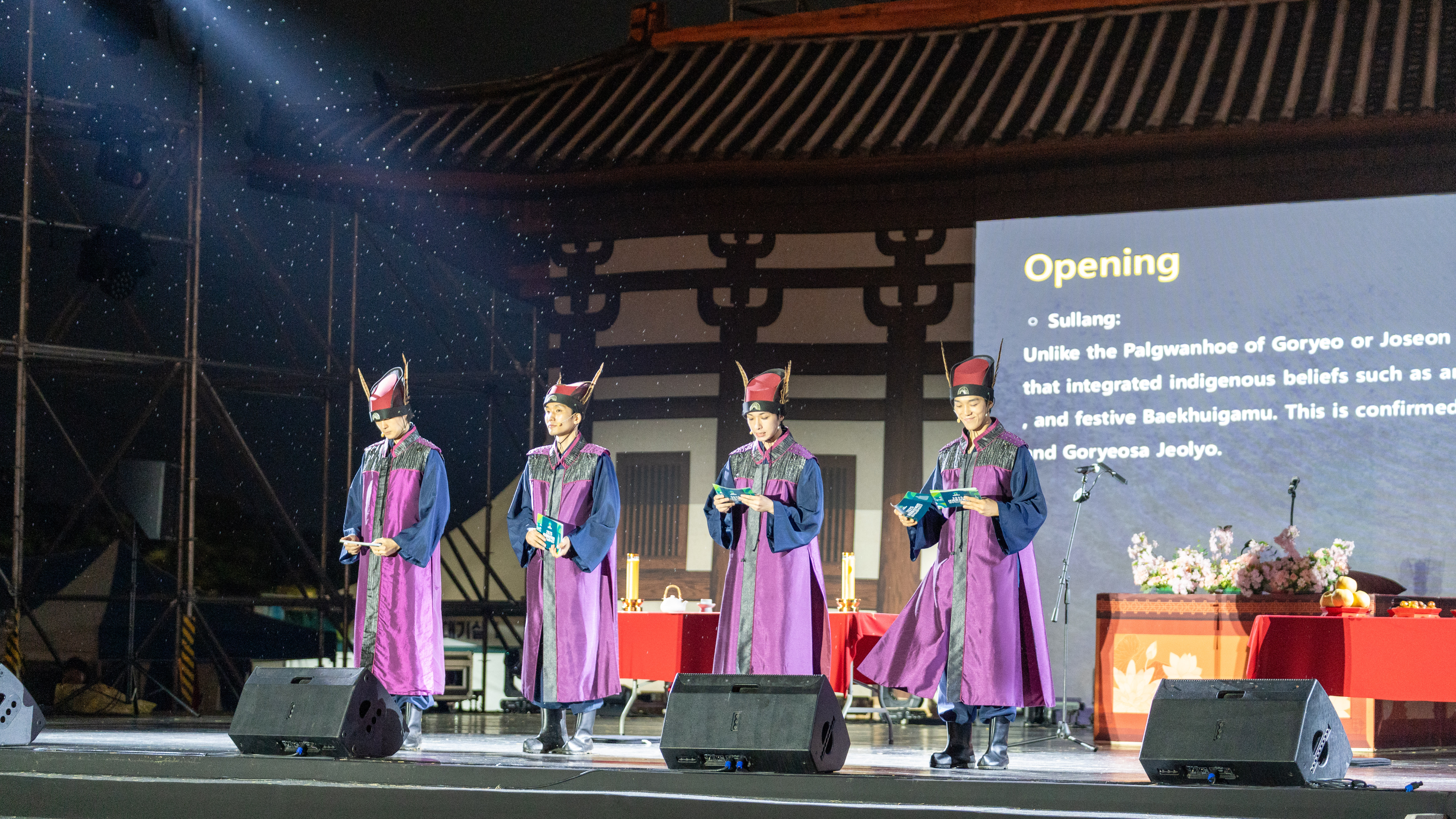 2025년 경주 세계유산 축전 팔관회 연희는 ‘뫼비우스의 띠’이자 숫자 8을 형상화한 위 이미지를 통해 과거로의 시간여행이자 불교의 윤회사상을 기본 개념으로 둡니다. 팔관회가 토착 신앙인 무속과 불교의 통합을 지향한 것처럼 ‘청신(請神)―오신(娛神)―송신(送神)’의 과정을 토대 안에 최치원의 향악잡영 5수를 근간으로 한 <가무백희>를 통해 이번 신라 팔관회만의 고유성을 보여줄 것입니다.